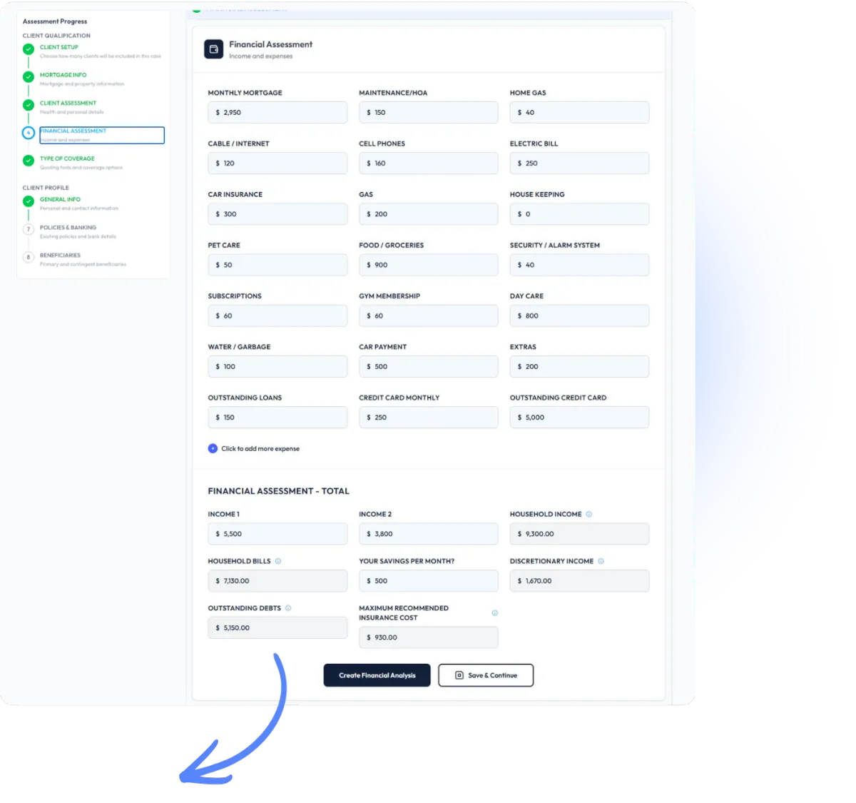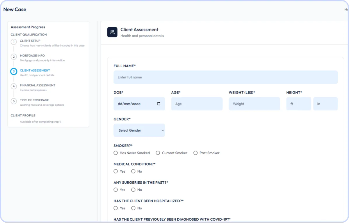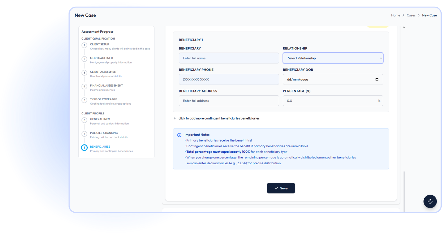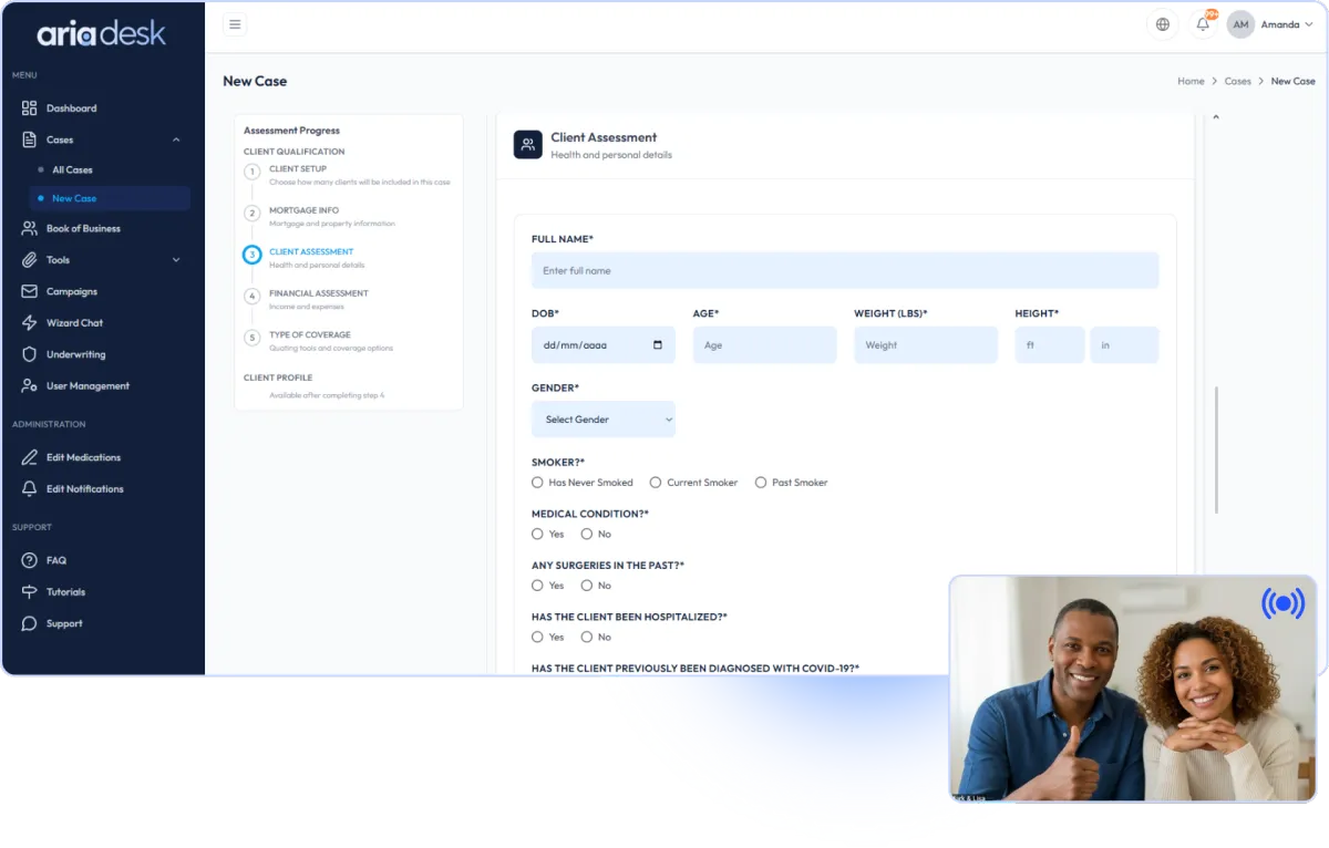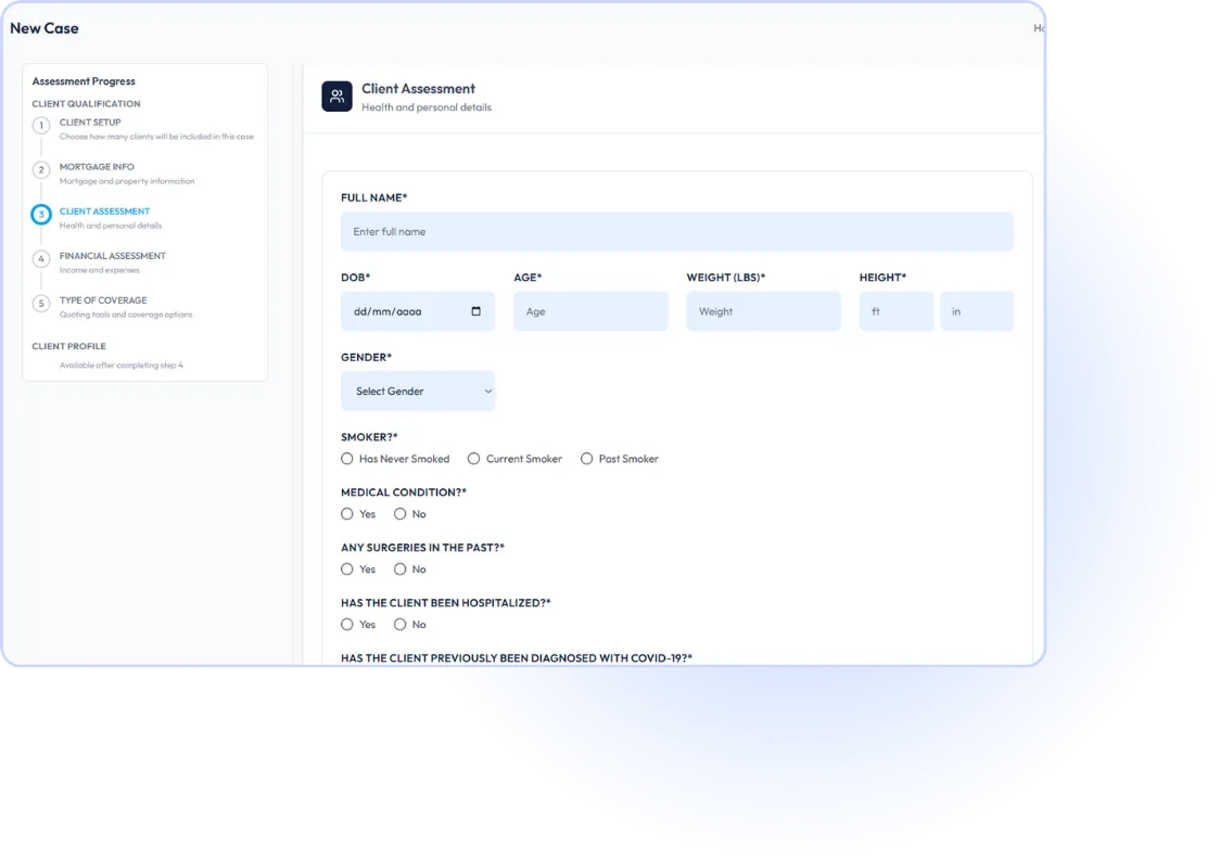 Create a case and enter your client’s mortgage, medical, and financial information while you are on the call.