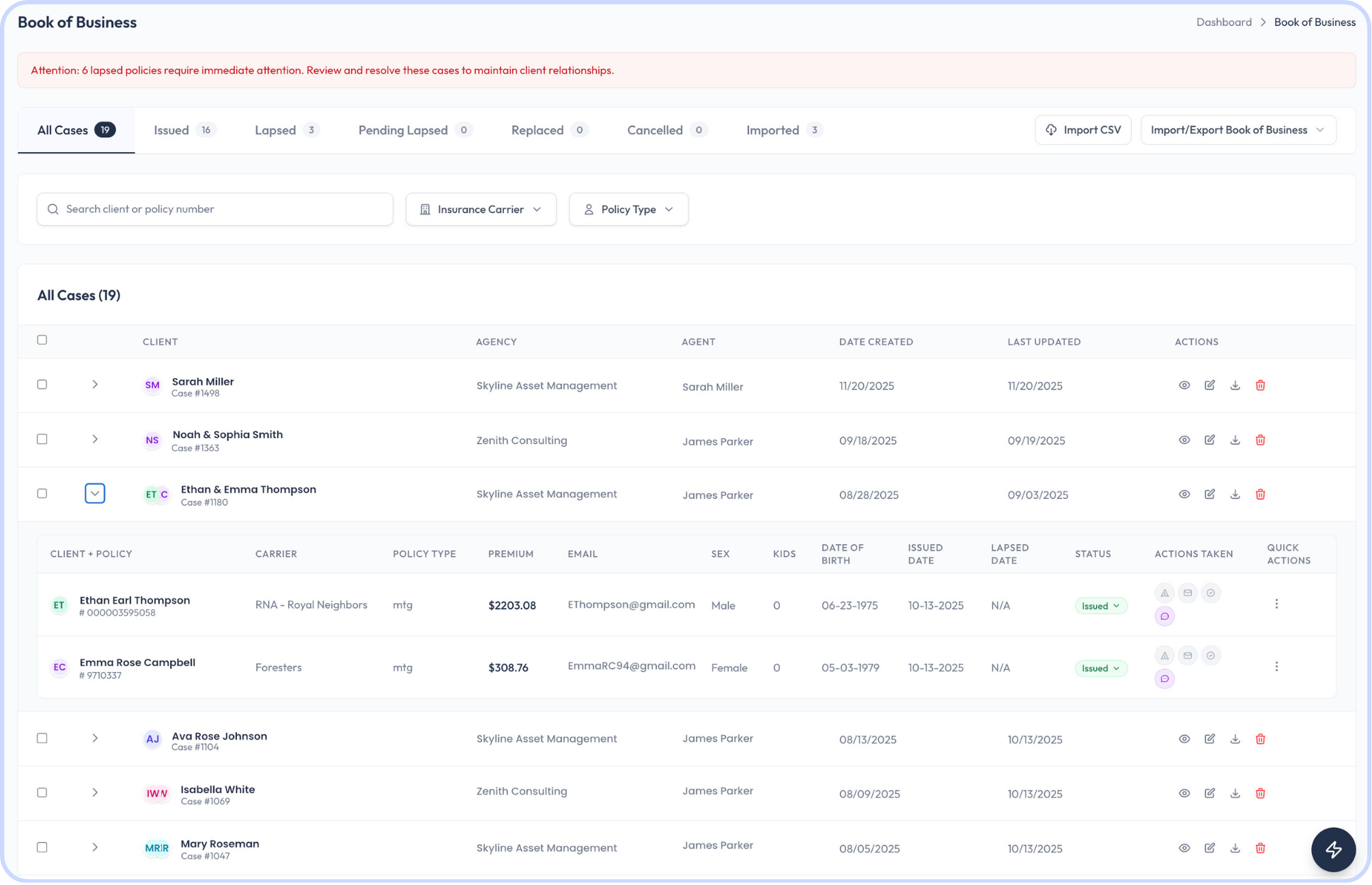 View all policies, search clients instantly, track case status, and maintain full visibility across your book of business.