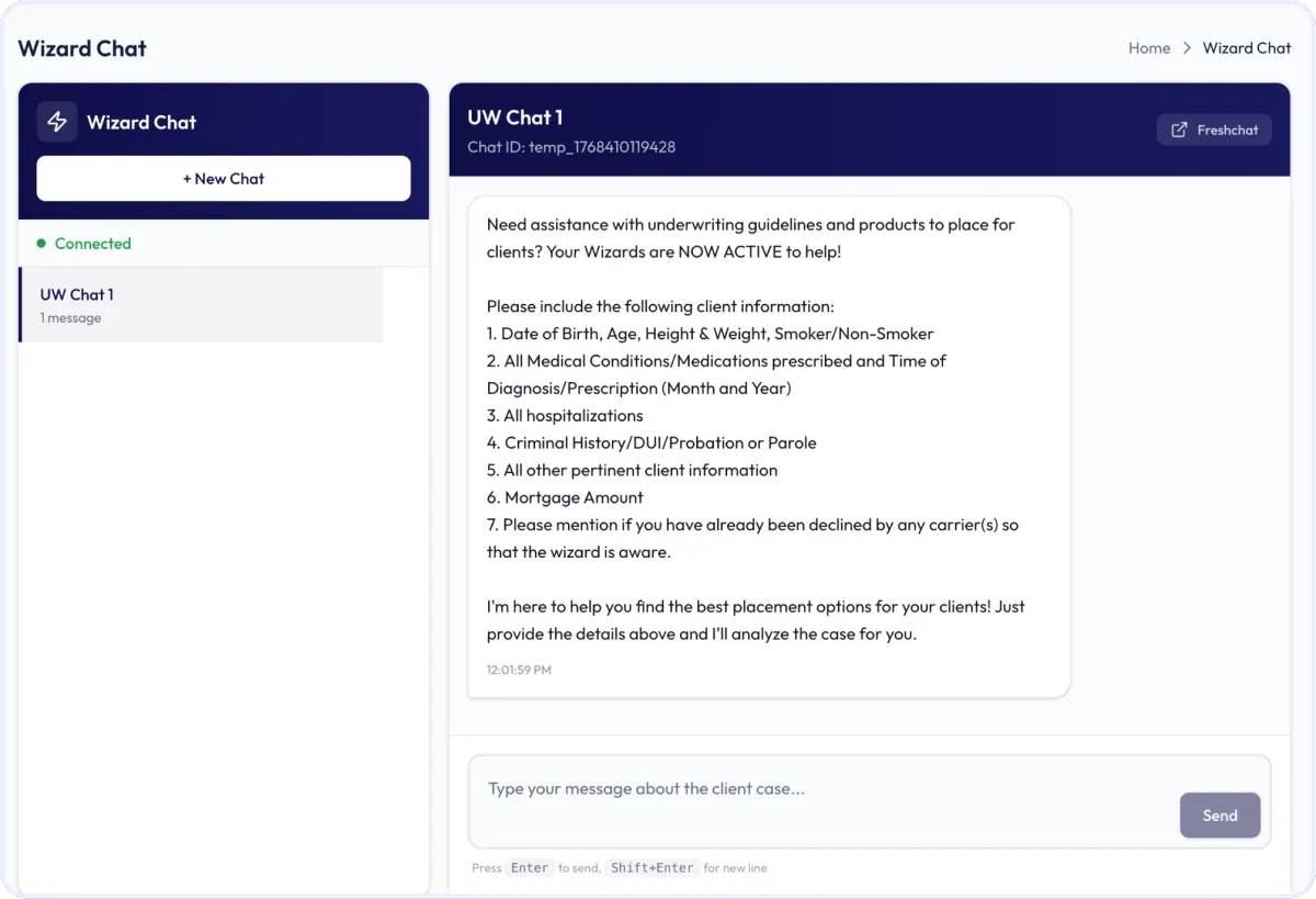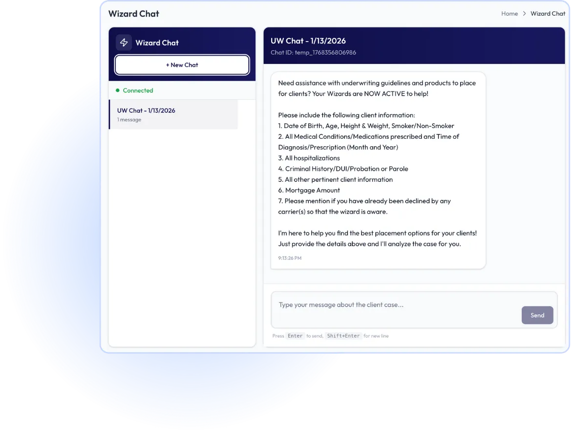 Client information is analyzed by the AI Underwriting Wizard, which analyzes their profile against your selected carriers’ underwriting guidelines and recommends the best match.